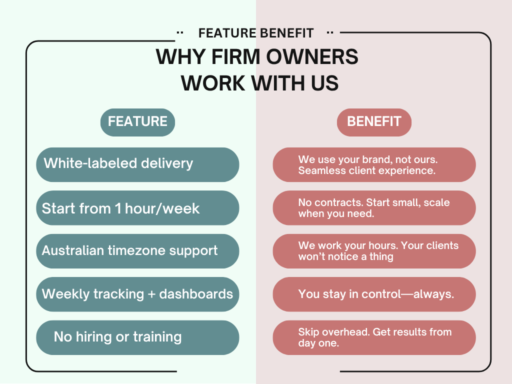 Scale your practice without hiring. Our Xero team works under your brand with zero overhead. Whether you’re a solo practitioner or a small firm, we handle the backend so you can focus on growth and client relationships.